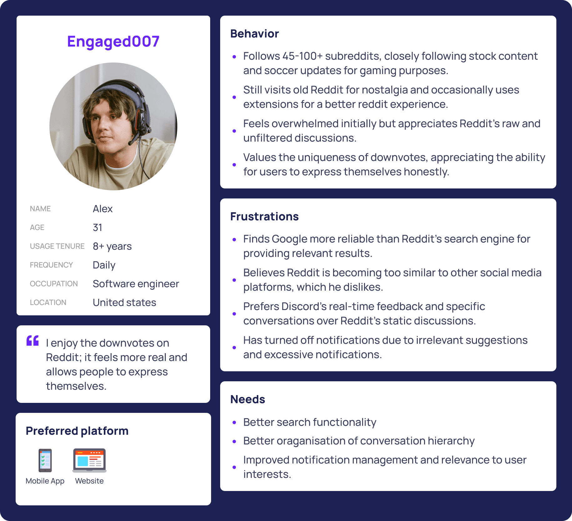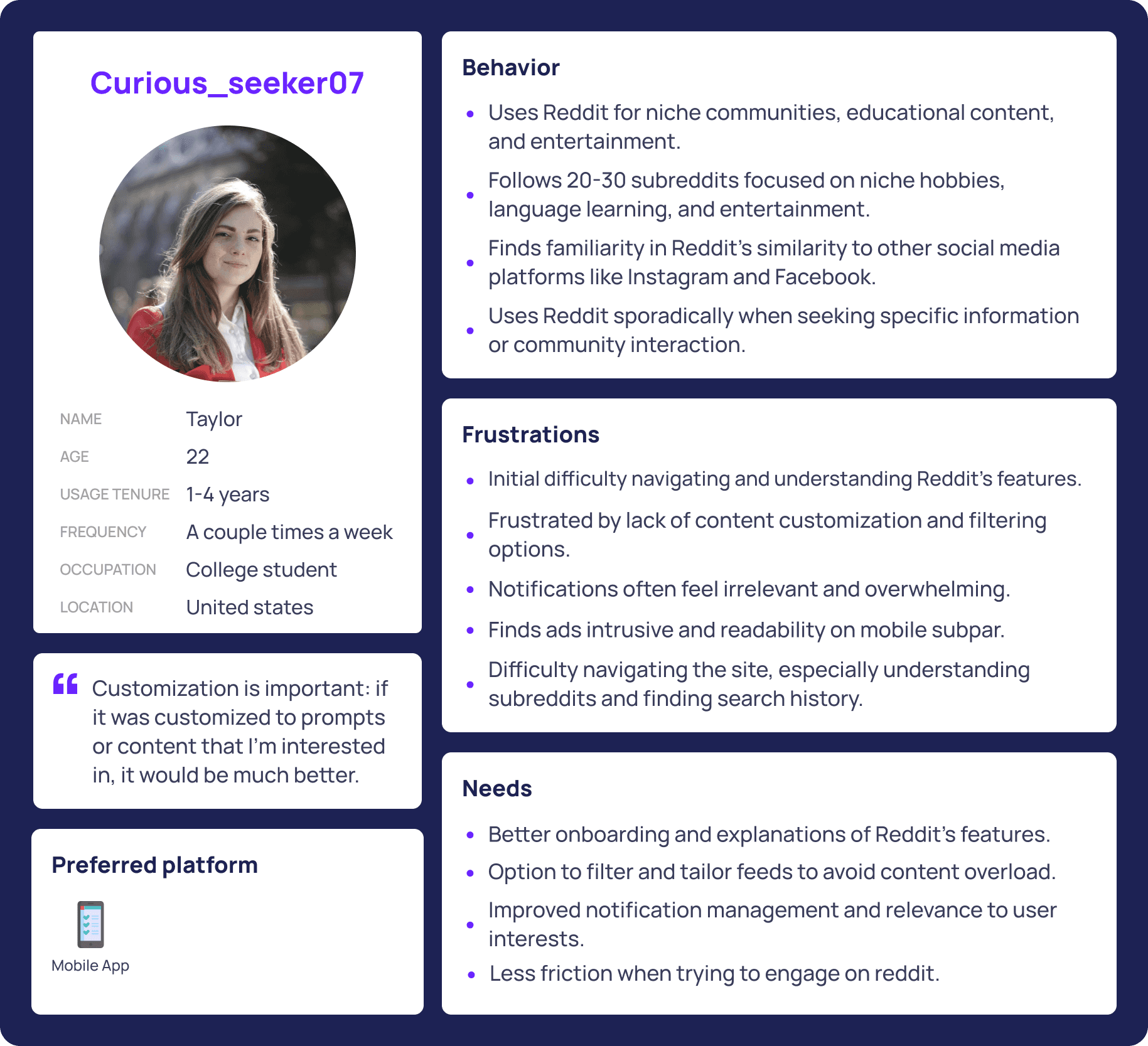 As a personal project, I set out to evaluate Reddit’s user experience looking at how different types of users engage with the platform, the challenges they run into, and where things could be improved. My goal was to understand the gaps between what users want and what the platform prioritizes, and to find ways to make those goals align better.
