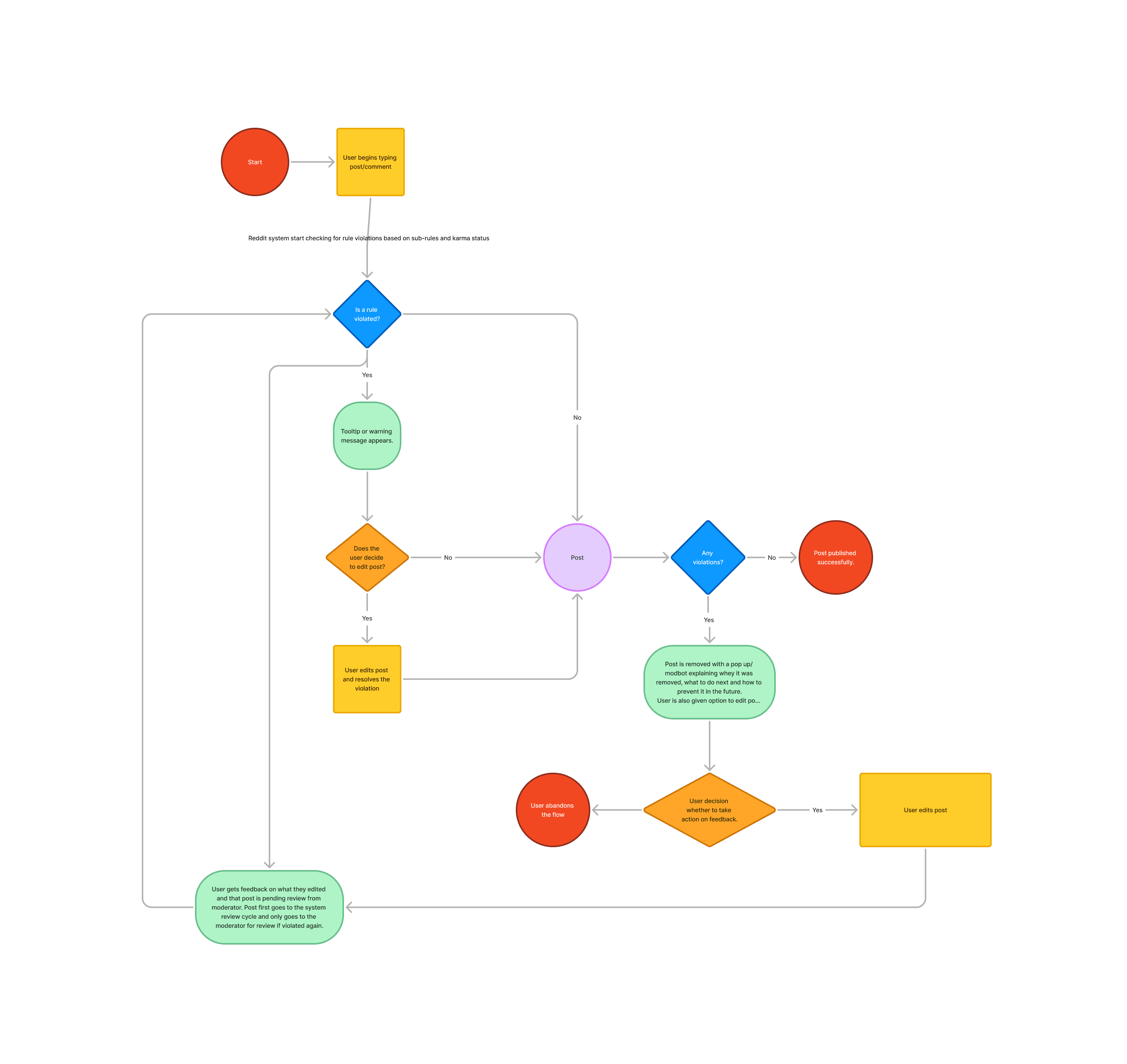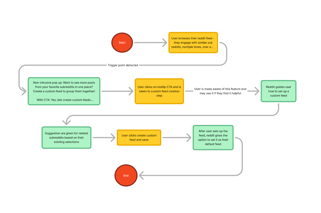 I created user flows for different feature awareness scenarios to understand how users discover and interact with existing tools on Reddit.